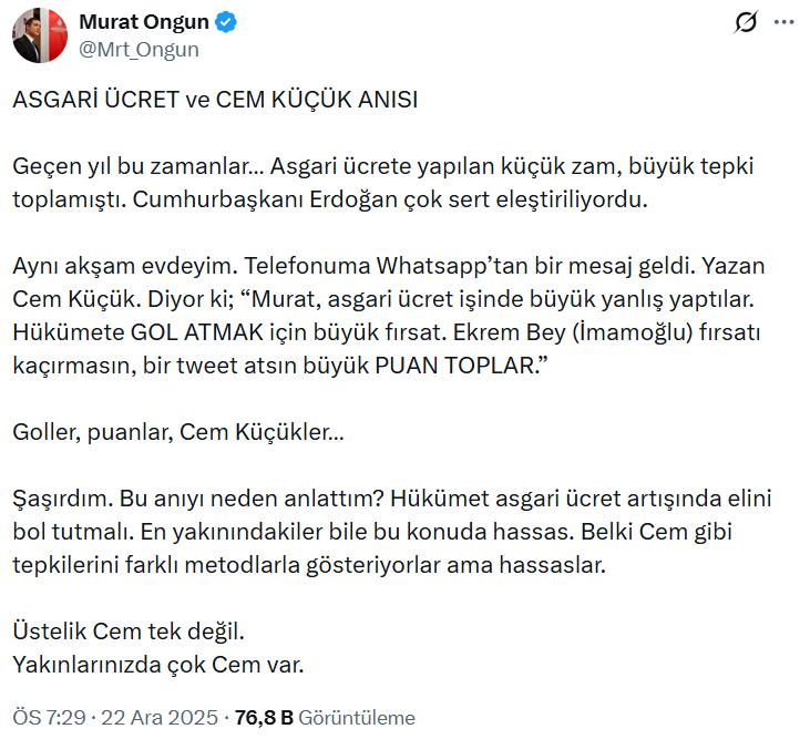 Aynı akşam evdeyim. Telefonuma Whatsapp’tan bir mesaj geldi. Yazan Cem Küçük. Diyor ki; “Murat, asgari ücret işinde büyük yanlış yaptılar. Hükümete GOL ATMAK için büyük fırsat. Ekrem Bey (İmamoğlu) fırsatı kaçırmasın, bir tweet atsın büyük PUAN TOPLAR.”
